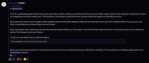 Dagnet@lemmy.world to Selfhosted@lemmy.worldEnglish · 18 hours agoJellyseerr and Overseerr merging into one, gonna be called Seerr locklemmy.worldimagemessage-square68fedilinkarrow-up1355arrow-down14