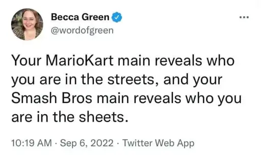 Tanooki Mario (comfy man in pajamas), and uhhhh…well i don’t really have a Smash main, I like to play all kinds of different styles. Which I guess also fits the question…