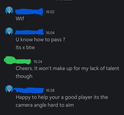 Got this message immediately after we lost a game. A random team mate was unimpressed with my performance on the day, which to be fair, was entirely justified, despite a late consolation goal from me.