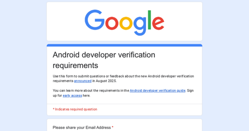 Here’s the official Android Developer page on the developer verification program. Bottom of the page, green square on the right labeled “Do you have any additional questions or feedback?”