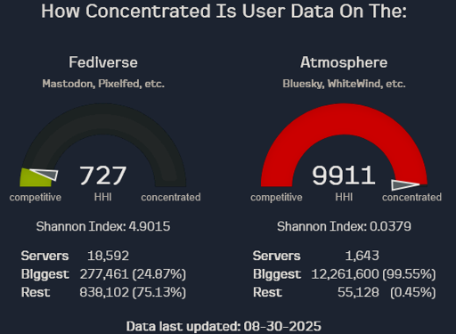 This site currently measures the concentration of user data for active users: in the Fediverse, this data is on servers (also known as instances); in the Atmosphere, it is on the PDSes that host users’ data repos. All PDSes run by the company Bluesky Social PBC are aggregated in this dataset, since they are under the control of a single entity. Similarly, mastodon.social and mastodon.online are combined as they are run by the same company.
