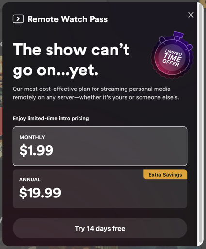 “Try our new Plex Pass Lifetime* Plus!”