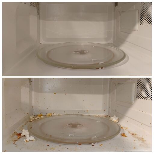 I’m going to take this as evidence that OP travels through time in the opposite direction. From their perspective, the microwave was dirty, so they put a bunch of popcorn and a paper bag in it. All the mess jumped into the bag, and the microwave became clean.
