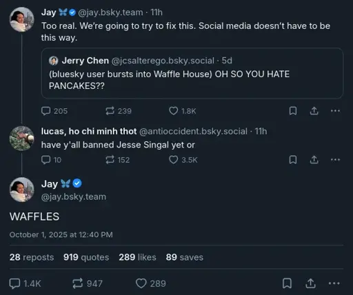I do genuinely believe that the Bluesky team set off from the start to create a decentralized protocol, but unfortunately for them they ended up running a social network. And at this point, AT Proto has become essentially a sort of ideological vaporware; a way for Jay Graber et al to run a social media platform while claiming they don’t run a social media platform.