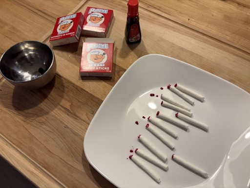 I like that these candy sticks commonly used to be sold as candy cigarettes, only for people to be outraged and so the companies changed them to generic “sticks,” just for you to go and dip the tip in red (they used to do the same, add more yellow to your red) reinventing candy cigarettes.