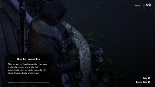 I went fishing and caught this huge ass Gar that was 16 lbs. I couldn’t figure out what to do with it so i just carried it around for a bit until i swapped it for a gator pelt. I had wanted to cook it though. Sorry fish.