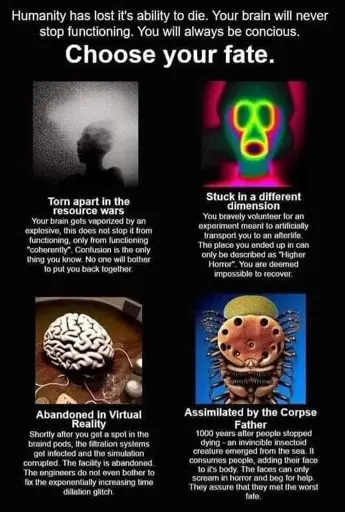 All of these scenarios suck, but I think the bottom left sounds the most potentially-enjoyable. If the worst thing happening is a “time dilation glitch” and I’m already conscious for eternity in each scenario, then does it really matter? Time would eventually be meaningless anyway. At least my mind would be intact and there’s no explicit pain (physical or emotional) involved.