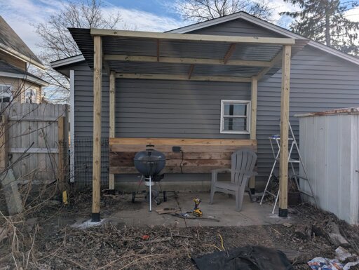 It’s mostly salvaged materials because of course it is, I built it. Anyway I wanted a barbecue shack, I’m always out there cooking, and why should only douchebags have outdoor kitchens? So I built this today in about 4 hours. I didn’t get a permit, don’t tell Babylon.