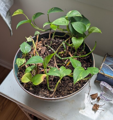 I love Pothos, they’re very forgiving and they communicate very well. They’re very good for people who tend to kill plants by loving them too much — I tend to water mine when they’re visibly beginning to look a bit sad. I don’t do stuff like spraying (I’ve found that this can lead to rot, and that I have an easier time keeping plants happy by thoroughly watering them even when the soil is dry at least an inch deep)