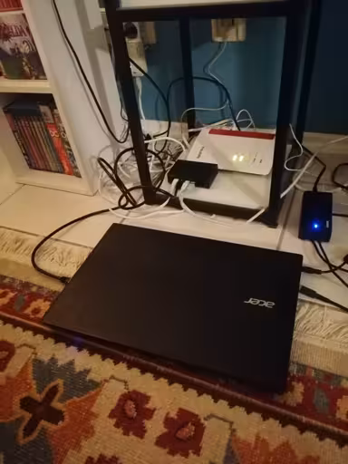 That’s what you see further to the back by the wall (50€ used, Fritz!Box 7510). Unfortunately, it only comes with one (1!!!) singular LAN port, so I had to buy a switch for 5 LAN ports in total (another 12€) which is sufficient for all the devices we use at home.